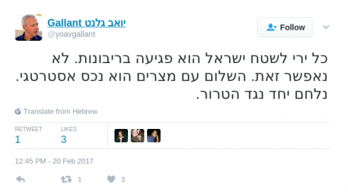 وكتب "جالانت" اليوم الاثنين على حسابه الشخصي بموقع التدوينات المصغرة "تويتر":أي إطلاق نار على الأراضي الإسرائيلية هو مساس بالسيادة. لن نسمح بذلك. السلام مع مصر كنز إستراتيجي. سنقاتل معا ضد الإرهاب".