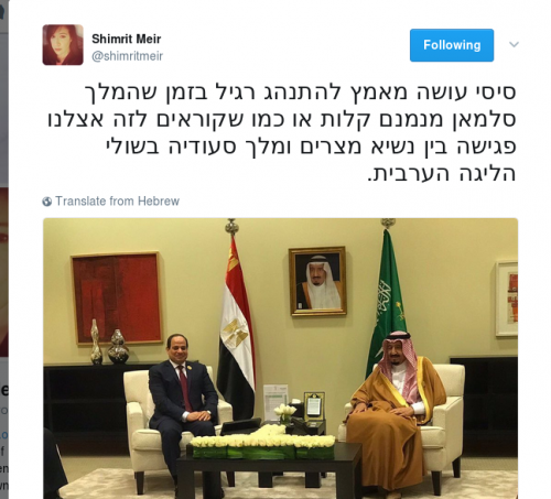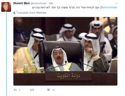 ونشرت الإعلامية "شيمريت مائير" على موقع "تويتر" عددا من الصور التي لاقت تفاعلا من معلقين إسرائيليين من بينها صورة جمعت الملك السعودي سلمان بن عبد العزيز آل سعود والرئيس المصري عبد الفتاح السيسي وكتبت معلقة :” يبذل السيسي جهدا للتصرف بشكل طبيعي، في وقت يغفو فيه الملك سلمان قليلا، أو كما يسمونه عندنا لقاء بين الرئيس المصري والملك السعودي على هامش القمة العربية".