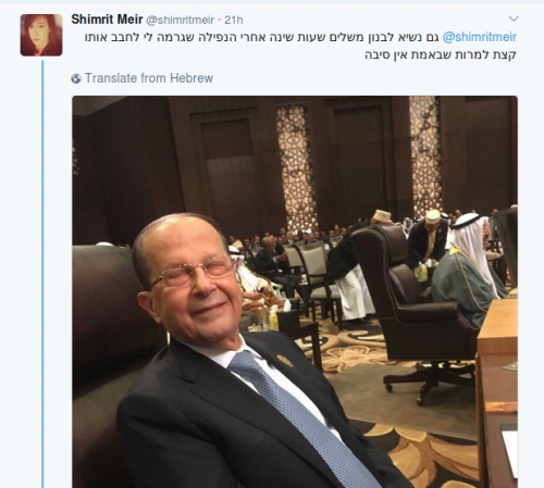وبخلاف صورة الملك السعودي، نشرت "شيمريت" صورة الرئيس اللبناني ميشال عون وهو يغط في نوم عميق وعلقت قائلة :”الرئيس اللبناني أيضا يكمل ساعات من النوم بعد السقوط الذي جعلني أحبه قليلا رغم أنه ليس هناك سببا لذلك". وذلك في إشارة إلى مشهد سقوط عون أمام المنصة الرئيسية بالقمة العربية خلال تجمع الزعماء العرب لالتقاط صورة جماعية، وقد سبقه في السقوط حاكم دبي الشيخ محمد بن راشد آل مكتوم، الذي تعثرت قدماه خلال نزوله من الطائرة في عمان.