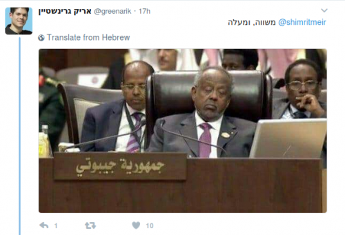 مغرد إسرائيلي آخر، نبه "شيمريت" إلى أنها نسيت رئيس دولة جيبوتي، ونشر صورة له وهو نائما، وهو ما حدث فعلا خلال إلقاء السفير أحمد أبو الغيط الأمين العام لجامعة الدول العربية كلمته.