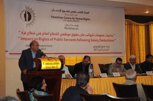 غزة / سوا/ نظم المركز الفلسطيني لحقوق الإنسان، اليوم الأحد ، ورشة عمل بعنوان: "تداعيات خصومات الرواتب على حقوق موظفي القطاع العام في قطاع غزة"، وذلك في ضوء قرار حكومة الوفاق الوطني تطبيق قرار خصم الرواتب على موظفي الحكومة المدنيين والعسكريين في قطاع غزة.