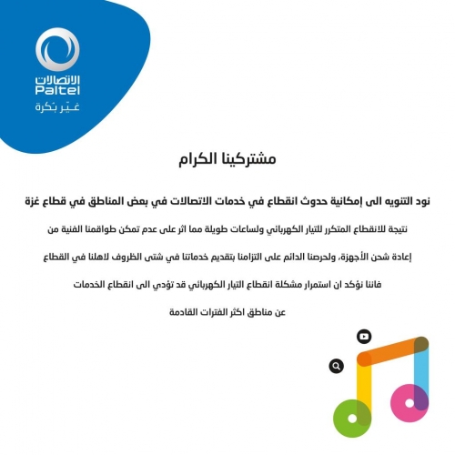 ونوهت الشركة الى امكانية حدوث انقطاع في خدمات الاتصالات في بعض المناطق بقطاع غزة ، نتيجة الانقطاع المتكرر للتيار الكهربائي ولساعات طويلة (..) مشيرة الي ان ذلك يؤثر على عدم تمكن طواقمها من إعادة شحن الأجهزة.