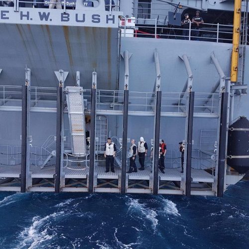 القدس / سوا / رست حاملة الطائرات الاميركية العملاقة، جورج بوش في ميناء حيفا، وتحمل السفينة التي يبلغ طولها 333 مترا، ستة الاف بحار ينوون الاحتفال بيوم الاستقلال الاميركي في حيفا.