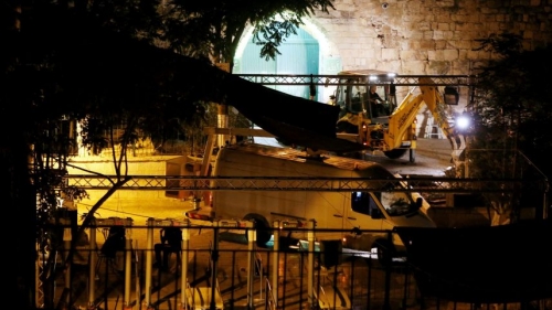وبحسب وسائل إعلام اسرائيلية، فإن قوات كبيرة من الشرطة رافقت مجموعة من المهندسين وعمال من بلدية الاحتلال الذين دخلوا منطقة باب الأسباط، ومعهم قواعد حديدية تستخدم في البناء ومواد معدنية أخرى، إضافة وشاحنات محملة بمعدات وآليات، بالإضافة الى جرافتين.