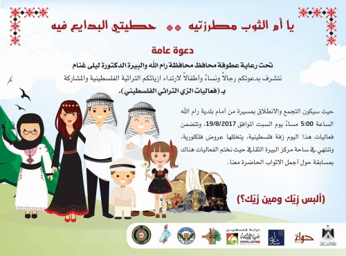 دعوة لتغطية فعاليات الزي التراثي الفلسطيني في كل من رام الله وجنين و نابلس والتي تتم بالشراكة مع عدد من المؤسسات المختلفة.