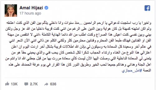 وتابعت: "إنني لا أنتقص من مهنة الفن أو الفنانين، فهناك طبعا الفن المحترم وفنانين محترمين كثر، ولكني أتكلم عن ذاتي. إنني الآن أشعر أنني في عالم آخر وسعيدة كل السعادة به، وستكون لي بإذن الله إطلالات قريبة بشكل آخر. أرددت اليوم أن أعلن اعتزالي هذا النوع من الغناء وارتداء الحجاب. شكرا لكل شخص كان يحب فني والذي يحبني حقاً هو من يتمنى لي السعادة الداخلية التي وصلت إليها الآن. ليست كأي سعادة مررت بها من قبل. جعلني الله أنا وأنتم من أهل الجنة، وهداني وهداكم جميعا لحب الخير وطريق النور. كان هذا القرار في يوم عرفة. الحمد لله على هذه النعمة".