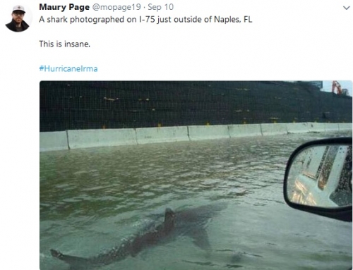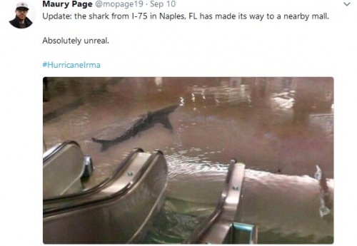 ونشر حساب "Maury Page " على موقع "تويتر" صورة لسمكة قرش تسبح في المياه التي خلفها إعصار "إرما" في فلوريدا، معلقا على الصورة بقوله:" الصورة تم التقاطها خارج مدينة نيبلز في فلوريدا".
