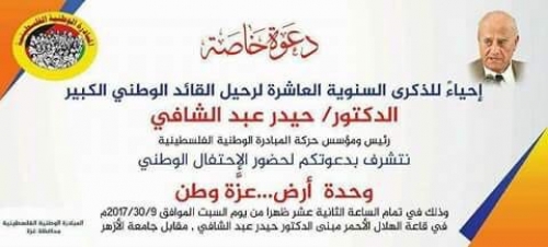للتغطية: نتشرف بدعوتكم لحضور الاحتفال المقام لإحياء الذكرى العاشرة للمناضل الوطني الكبير د.حير عبد الشافي غدا السبت الساعة ١٢ ظهرا، في مبنى جمعية الهلال الأحمر مقابل جامعة الأزهر.