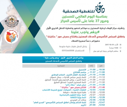 يتشرف مركز الوفاء لرعاية المسنين بدعوتكم لحضور وتغطية الحفل الخيري الأول #برهم_واجب_علينا واطلاق المجلس التأسيسي لأصدقاء المسنين وافتتاح معرض صور " حكايتنا " بحضور شخصيات وطنية ومؤسسات.