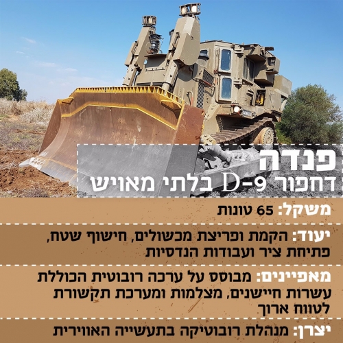 ووثق طاقم من موقع صحيفة "يديعوت أحرونوت"، زار مركز التجارب، ما يطلق عليه "باندا" وهو "D9" غير مأهول، ومحصن ضد الرصاص، وتبلغ زنته نحو 65 طنا، وكذلك "روبتل"، وهو عبارة عن دمج روبوت ضخم وأداة هندسية، ويتم التحكم به عن بعد، وقادر على تنفيذ مهمات بمفرده.