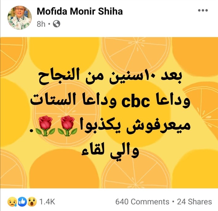 وكانت قد أعلنت الإعلامية مفيدة شيحة، في منشور على حسابها بـ"فيسبوك" عن مغادرتها برنامج "الستات ميعرفوش يكدبوا" الذي يُعرض على قناة cbc بعد مرور عشر سنوات على عملها في البرنامج، دون أن توضح مزيدًا من التفاصيل.