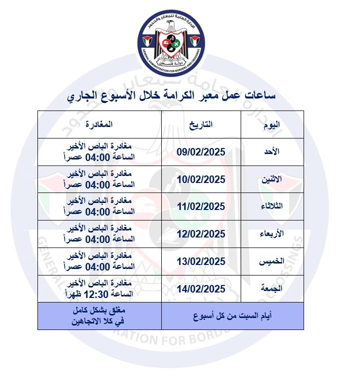 أعلنت الإدارة العامة للمعابر والحدود، اليوم الأحد، 09 فبراير 2025، ساعات عمل معبر الكرامة (جسر الملك حسين) خلال الأسبوع الجاري.