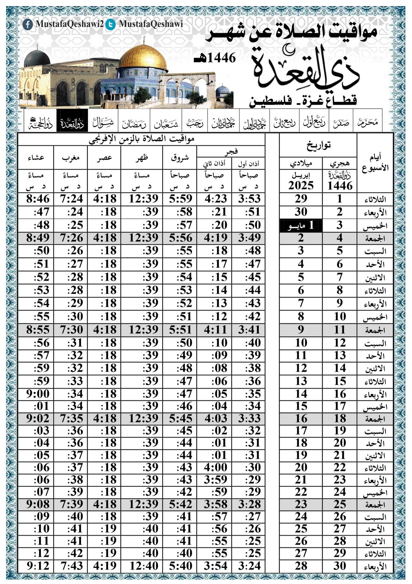امساكية ذي القعدة ومواعيد الصلاة في قطاع غزة - فلسطين