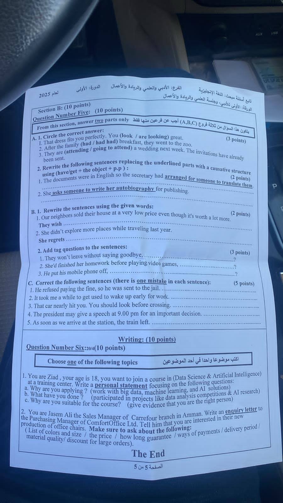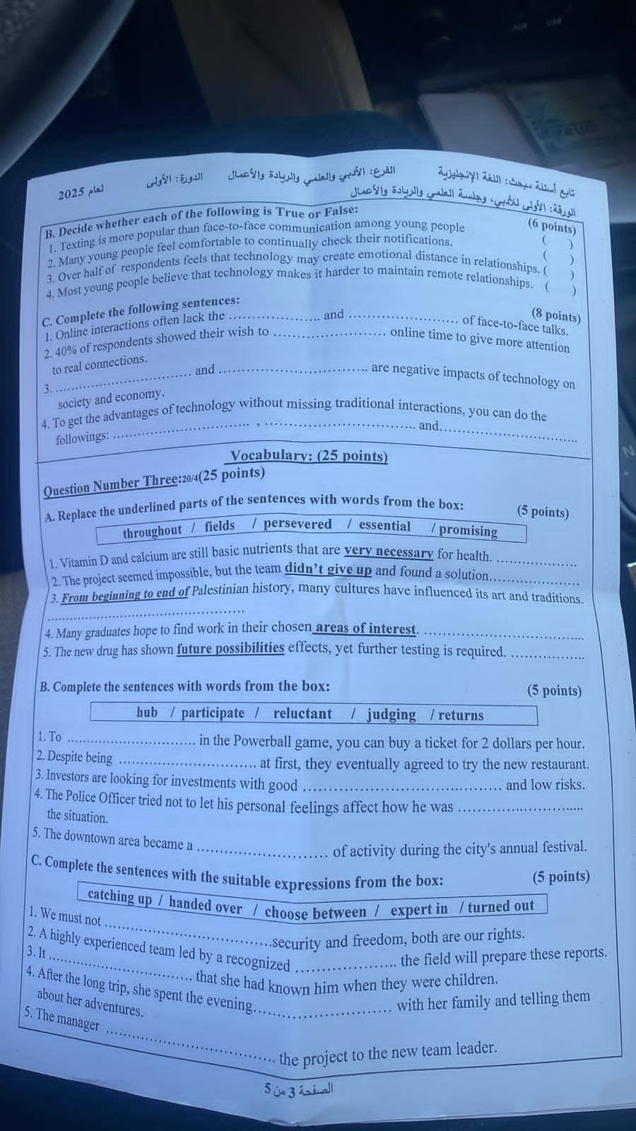 وبعد انتهاء جلسة الامتحان والتي بدأت عند الساعة التاسعة صباحًًا، يبحث كثير من طلبة الثانوية العامة عن إجابات امتحان اللغة الإنجليزية 2025 توجيهي فلسطين، حتى يتسنى لهم معرفة الإجابات الصحيحة من الخاطئة.