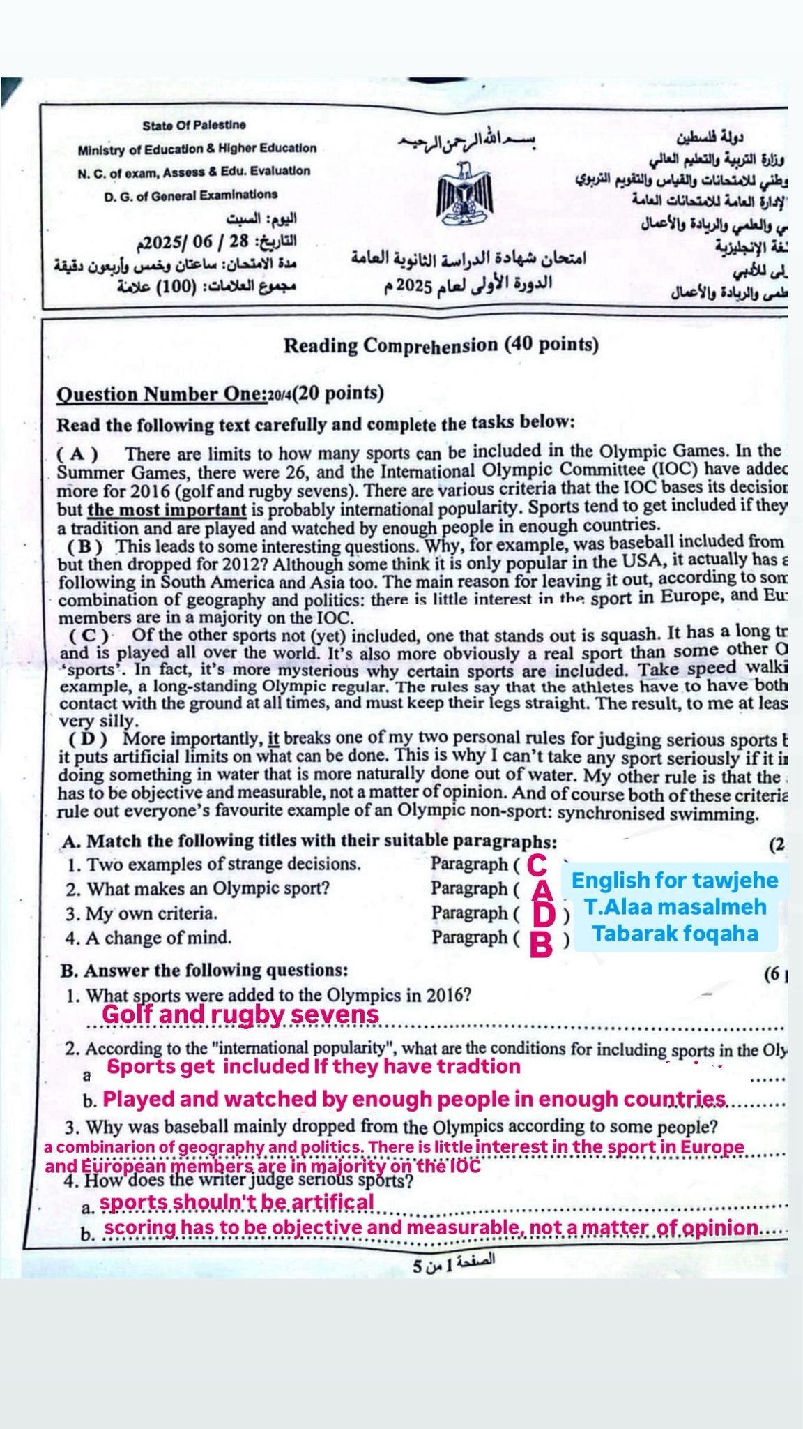 وتعرض لكم وكالة سوا الإخبارية، في هذه المقال، إجابات امتحان اللغة الإنجليزية 2025 توجيهي فلسطين، والتي يضعها أساتذة اللغة والمختصون، حيث يضعون إجابات نموذجية حيث يستطيع الطلبة تقييم إجاباتهم.