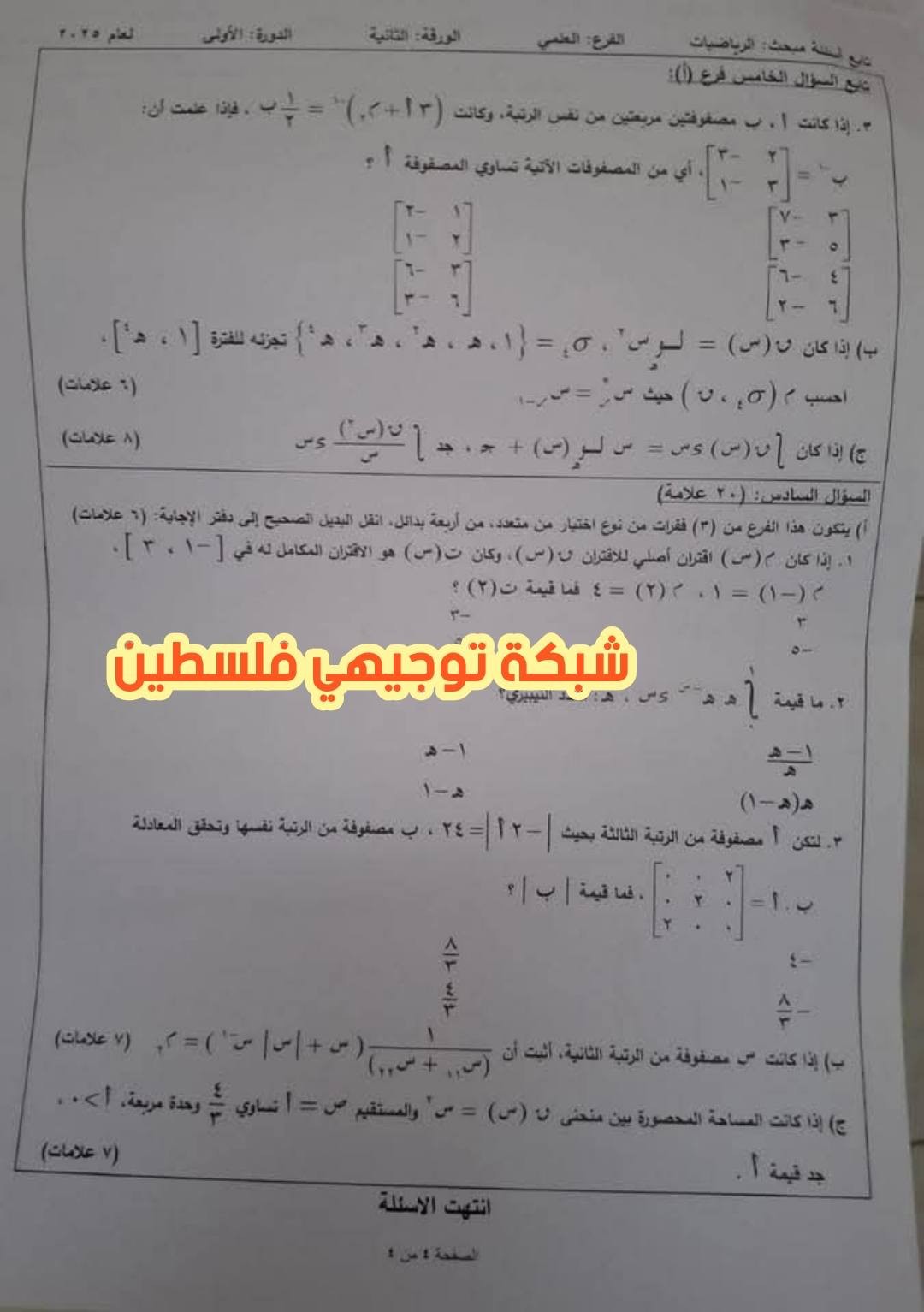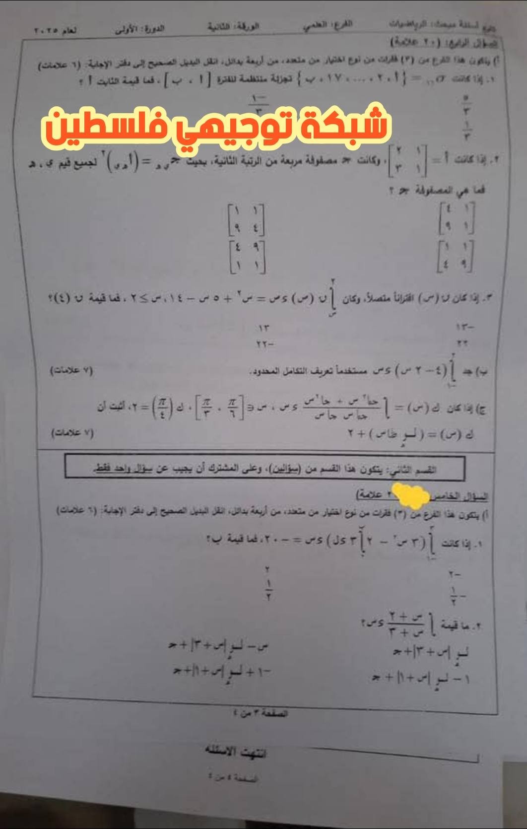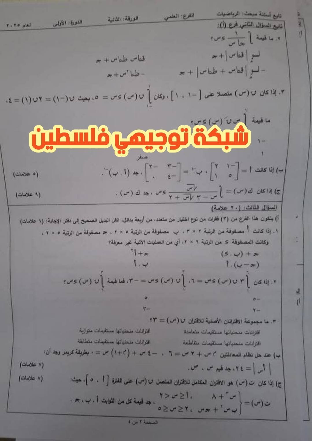 أسئلة امتحان الرياضيات 2 توجيهي 2025 في فلسطين: الفرع العلمي