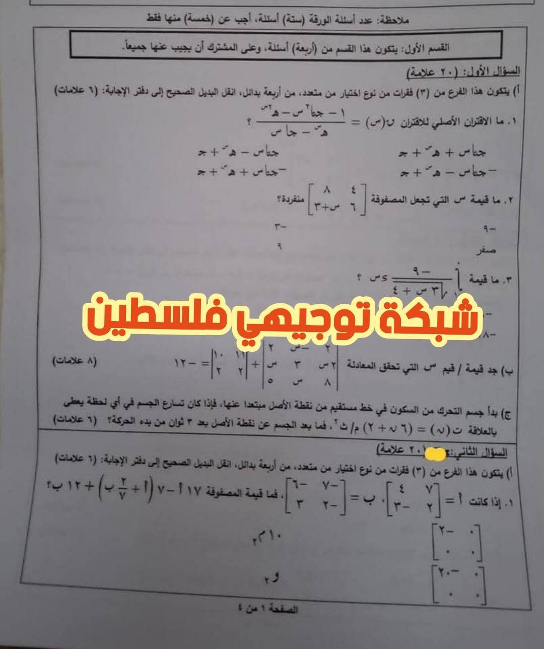 إجابات امتحان الرياضيات الورقة الثانية توجيهي 2025 في فلسطين الفرع العلمي: "بالصور" ((أسئلة الامتحان بالأسفل))