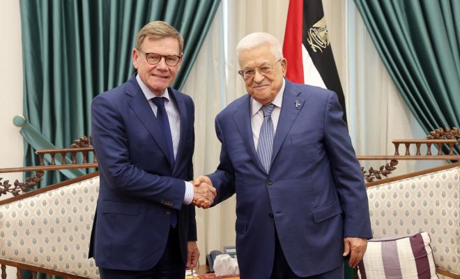 وثمن الرئيس عباس، تصريحات الوزير الألماني الداعمة لحل الدولتين وبناء مؤسسات الدولة الفلسطينية، وتأكيده على وحدة الأراضي الفلسطينية تحت السلطة الفلسطينية، كذلك الشكر على ما تقدمه ألمانيا من مساعدات إنسانية لقطاع غزة و الأونروا ودعم بناء المؤسسات وتنفيذ برامج الإصلاح الفلسطيني، وكذلك مواقفها المؤكدة على وقف إطلاق النار وإدخال المساعدات الإنسانية ومنع التهجير.