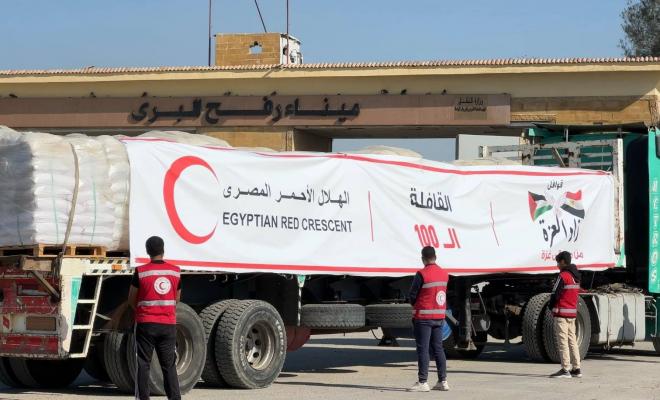 أطلق الهلال الأحمر المصري، صباح اليوم الثلاثاء، قافلة «زاد العزة .. من مصر إلى غزة » رقم 100، والتي تحمل عدد من شاحنات المساعدات الإنسانية العاجلة في اتجاه قطاع غزة، وذلك في إطار جهوده المتواصلة كآلية وطنية لتنسيق المساعدات إلى غزة.