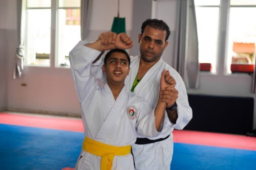 الطفل يوسف الشريف الذي لم ينهِ عقده الأول بعد شعر أن بعض وسائل الإعلام جاءت لترصد حكايتهم، فأراد أن يستعرض مهاراته القتالية التي أصبح يتقنها جيداً، وقف في وسط القاعة التي تغطي أرضيتها ألواح "إسفنجية"، وراح يمارس ما تعلمه من رياضة الكاراتيه. كانت حركات ذلك الطفل فاقد البصر متقنة وسريعة، يقفز في الهواء في حركة التفافية ثم يركل وهكذا.