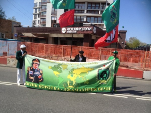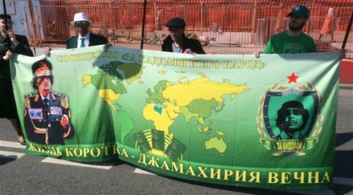 وتظهر صور مجموعة من المتظاهرين يرفعون لافتة في موسكو حملت صورة معمر القذافي، وعلّق أحدهما عليها قائلاً "الحزب الشيوعي متذكراً القذافي"، وكتب على اللافتة "الشيوعية نهج القذافي وشعبه".
