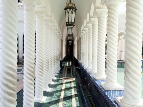 أما باحة المسجد الداخلية فتتميز بالأعمدة الرخامية المقوسة والنوافذ الزجاجية الملوّنة، فيما صنعت الثريات في انكلترا، ونقل السجاد الفاخر من المملكة العربية السعودية. وتغلف القبة الرئيسة 3.5 مليون قطعة فسيفساء متشابكة مع أوراق الذهب الحقيقي.