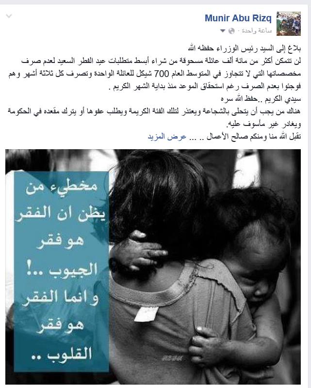 رام الله / اعلن الكاتب الصحفي منير أبو رزق انه تقدم ببلاغ مفتوح إلى الدكتور رامي الحمد الله رئيس الوزراء ، طالب خلاله الأخير بالتحقيق في الأسباب التي حالت دون قيام وزارة المالية بصرف المخصصات الإغاثية لأكثر من مائة ألف عائلة مسحوقة قبيل عيد الفطر السعيد والتي لا تتجاوز في المتوسط العام 700 شيكل لكل عائلة.