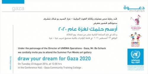 تحت رعاية مدير عمليات وكالة الغوث الدولية- غزة السيد بوشاك يتشرف بدعوتكم لحضور معرض "ارسم حلمك لغزة عام 2020"