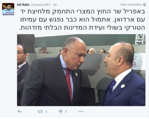 وقال “كايس” في تغريدة بحسابه الخاص على موقع “تويتر”:"في أبريل تملص وزير الخارجية المصري من مصافحة أردوغان. وبالأمس التقى نظيره التركي على هامش قمة عدم الانحياز".