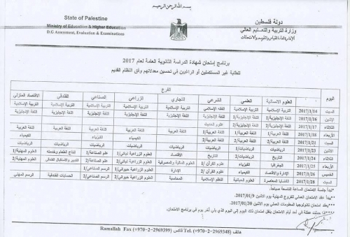 وبينت الوزارة أن الامتحان العملي للفروع المهنية يبدأ يوم الاثنين 9/1/2017، ويعقد امتحان تكنولوجيا المعلومات العملي يوم الاثنين 30/1/2017.