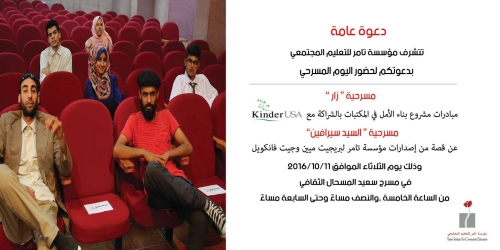 للتغطية/ تتشرف مؤسسة تامر للتعليم المجتمعي بدعوتكم لحضور اليوم المسرحي "مسرحية -زار" .. بتمام الساعة الخامسة والنصف وحتى السابعة من مساء يوم غدا الثلاثاء الموافق 11/10/2016في مسرح سعيد المسحال الثقافي..