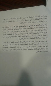 كما أكد المتحاورون، ضرورة التمسك بالشرعية الفلسطينية ممثلة بمنظمة التحرير الفلسطينية رئيسا ولجنة تنفيذية ومجلس وطني لضمان استمرار الاستقرار الوطني واستكمال مسيرة عودة الأراضي المحتلة لإقامة الدولة الفلسطينية.